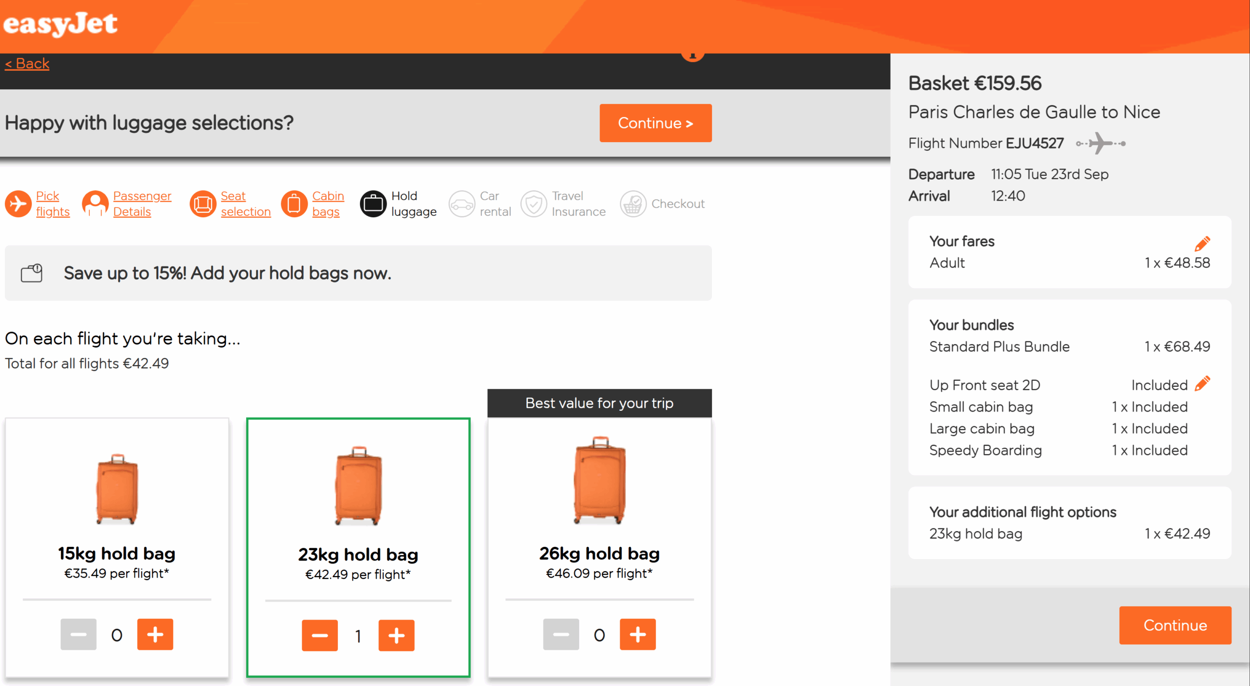 Costs will also depend on how much you’re carrying. For instance, on the best-priced date in September 2025, easyJet had fares starting for just under €50. But then, there’s baggage. This airline charges more for a proper ‘cabin bag’ – the kind that lives in the overhead lockers. And more again for a checked bag. If you need the lot, you may be able to save a little by purchasing a bundle that also includes ‘speedy boarding’ and sitting closer to the front. But once you’ve got all of that covered, it takes the total price to almost €160, one-way.