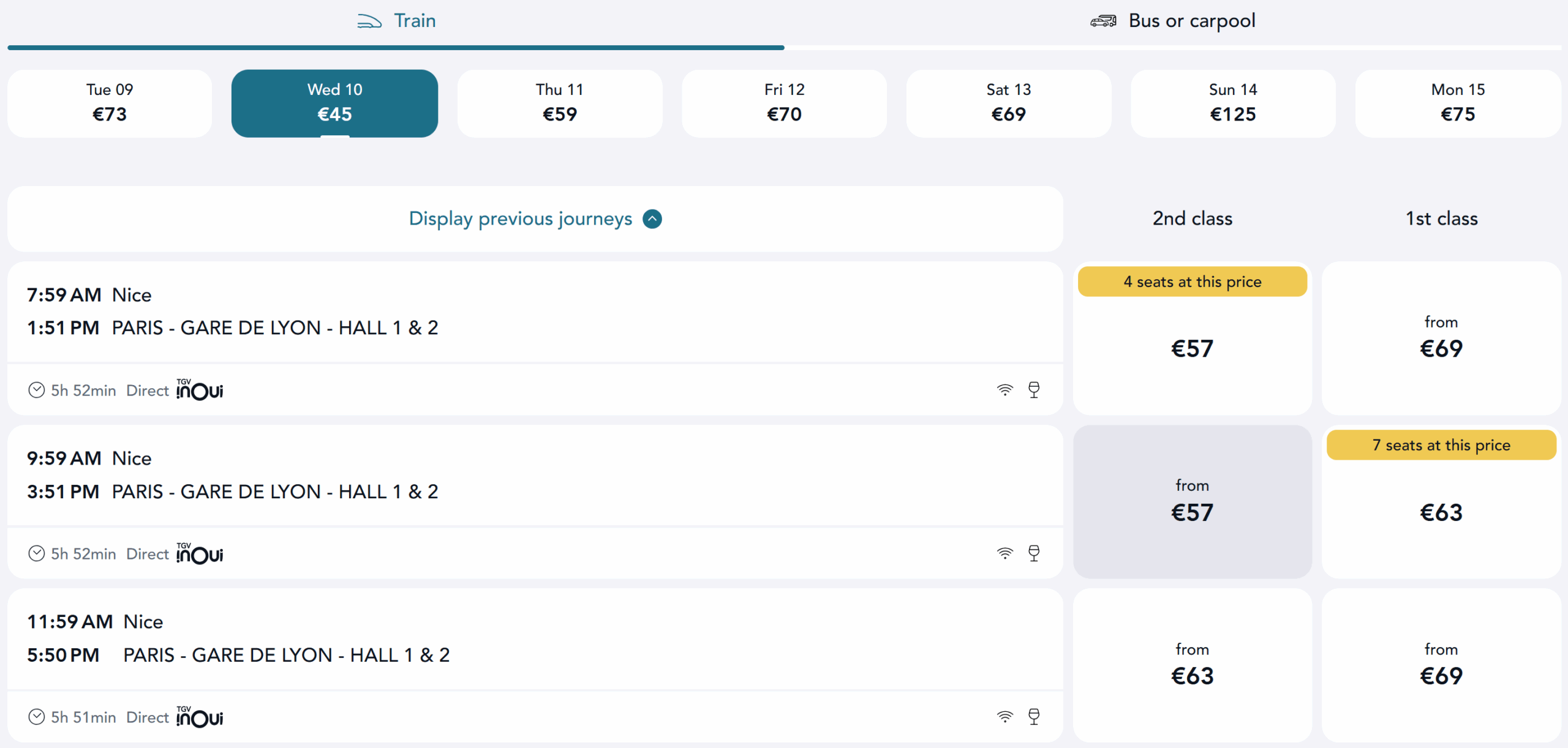 That’s for Economy Class travel. But if you cast your eyes to the TGV high-speed rail, you may be able to travel First Class for a lower price than easyJet Economy. For instance, from €63, based on dates we’ve searched.